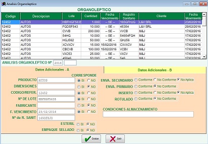 Analisis organoleptico.- verificacion de las condiciones del producto si corresponde a las domensiones, codigo/refere, N de lote, fabricante, fecha de vencimiento, registro sanitario, envase secundario, envase primario, inserto, rotulado, condiciones de almacenamiento, resultado de la evaluacion, fecha en que el producto sale de cuarentena, etc..